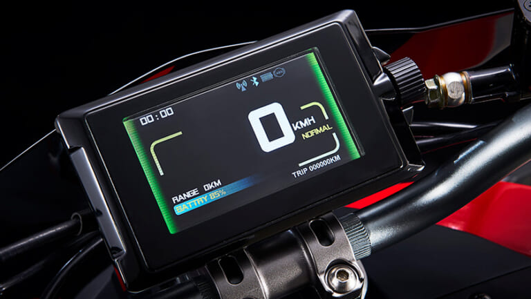 メーターはフルカラーで、バッテリー残量などを示す。急速充電なら2時間で満充電となり、航続距離は120kmを誇る。