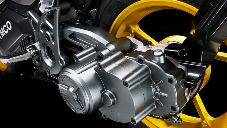 電動バイク初のオートマ2速ミッションを搭載し、圧巻の加速を実現。モーターとの一体型で超コンパクトだ。
