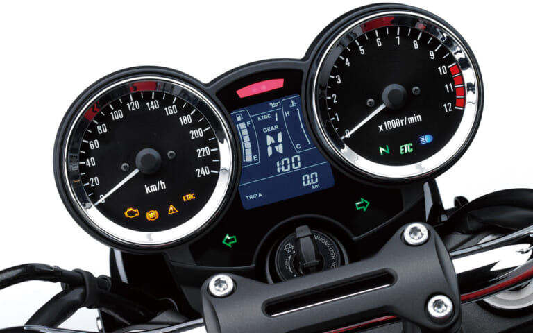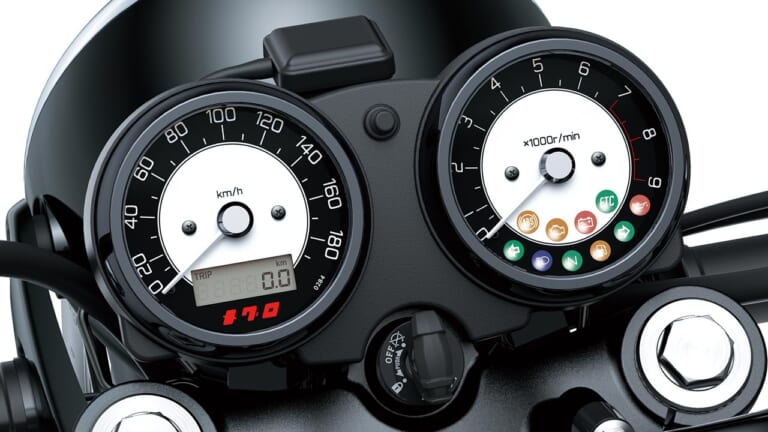 【カタカナロゴも】メーター文字盤は専用デザインで”メグロ”のカタカナロゴも入っている。ユニット自体はW800と共通だ。