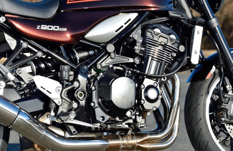 オリジナルZ1と比べるとエンジンは同排気量でも驚くほどコンパクト。空冷風のフィンも施されている。