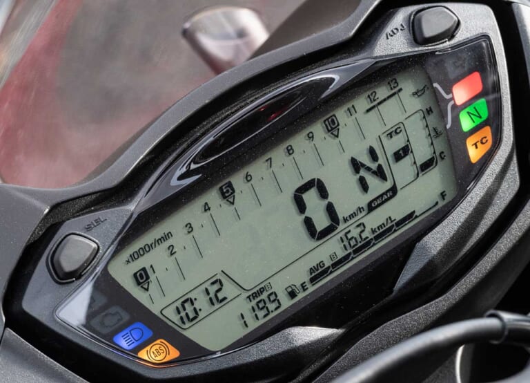 モノクロ液晶のデジタルメーターを採用。輝度調整が可能で、バックライトはホワイト色だ。燃費計は瞬間/平均や航続可能距離を表示可能。
