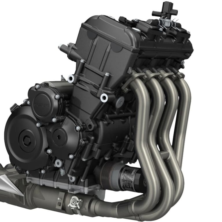 【名作のRユニット】名作と評判の高かった’05GSX-R1000の直4エンジンをベースにチューニング。気筒間に設けられたベンチレーションホールがポンピングロスを減らしている。