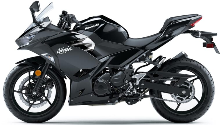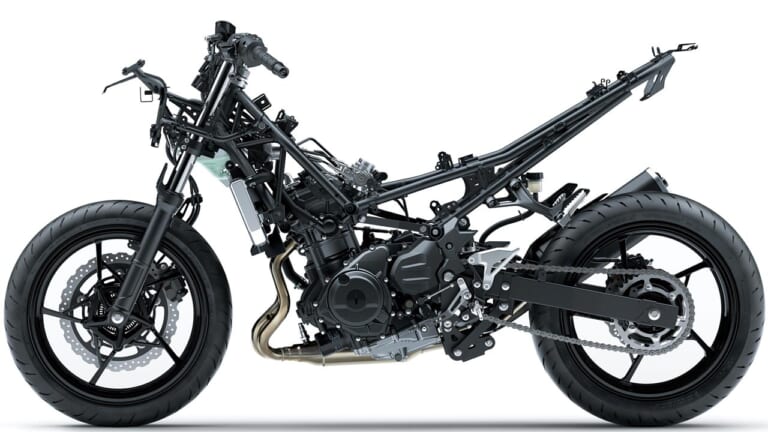 ’18年モデルで大幅なモデルチェンジを行い、それまでのツアラー路線から一気にスポーツ路線へと方向転換を図った「ニンジャ400」。その最大の功績は、ニンジャ250との車体の共用である。つまり250ccクラスの軽量な車体に、48ps/398ccのパラレルツインエンジンを載せる。単純に軽い車体にパワーのあるエンジンを搭載すれば速いというド正論だが、これが案外難しい。400ccのパワーを受け止めるべく、このクラスとしては太めのφ41mmのフロントフォークを採用した一方で、メインフレームで大きな軽量化を実施。ニンジャH2にも使われた手法=スイングアームマウンティングプレートをこのクラスに投入することで、軽量かつ必要な剛性をもったフレームを手に入れることになったのだ。