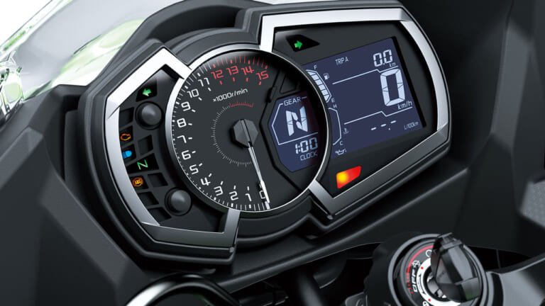 【希少性が増すアナログタコメーター】いまや指針式タコメーターは希少種であるが、機能はフルスペック。左側にギヤポジションとはじめとする各種項目が表示され、左はインジケーター類。
