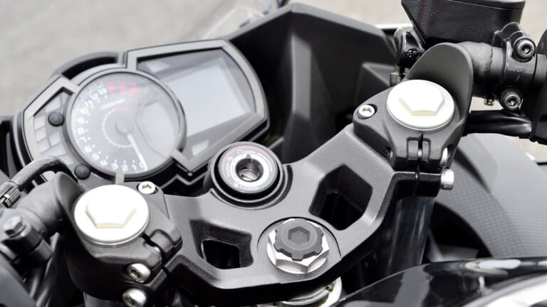 【ガルウイングタイプ】φ41mmのフロントフォークを受け止めるトップブリッジは段付きのガルウイング形状。中央部は肉抜きが施されていていかにもスポーティーだ。