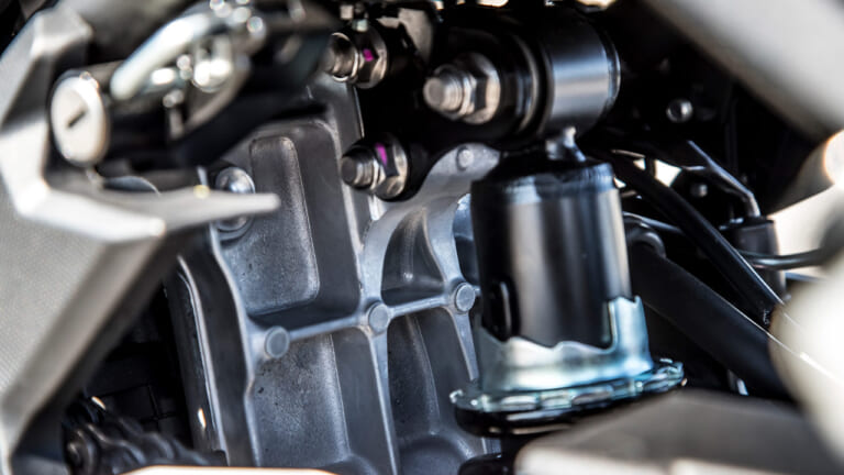 【骨盤がポイント】フレーム作りには最新の解析技術を使用し、必要なフレーム剛性を確保しながら、最大限の軽量化を実施。その最大の功労者は、エンジン背面に結合されたスイングアームマウンティングプレート。これによりクロスメンバーを使用せずに強度アップを図ることができたという。