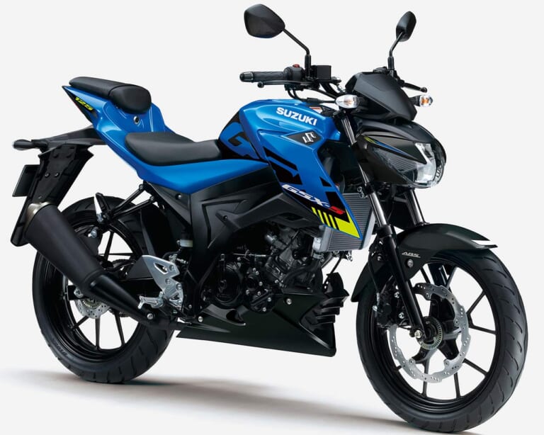 GSX-R125をベースに、バーハンドルでアップライトなポジションに仕立てたファイター系ネイキッド「GSX-S125」は、足着きも良好。縦2灯のライトユニットはGSX-Rと同一だが、精悍なライトカバーやメーターバイザーによって見事にイメージを変えている。’20年に液晶メーターを視認性の良い反転表示に変更し、ハザード機能も追加して利便性を向上。’21モデルでは青/黒2色のグラフィックを変更した。