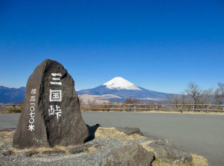 かつての相模国・駿河国・伊豆国の国境に位置していたことが名前の由来となる三国峠。富士山の全景が臨める、芦ノ湖スカイラインで最も見晴らしの良い展望スポット。富士山、南アルプス、駿河湾、伊豆半島まで見渡せる。