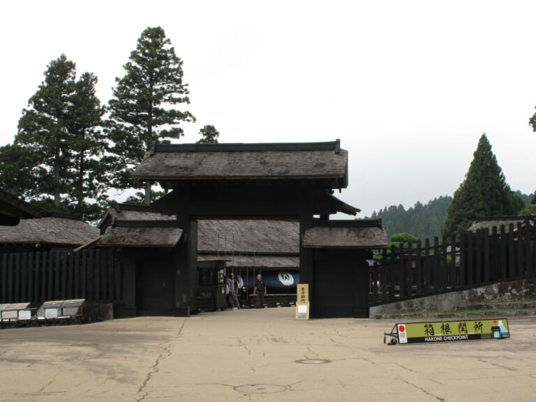 写真左は芦ノ湖スカイラインに一番近い「道の駅 箱根峠」。気軽に休憩するのに丁度よい道の駅だ。国指定史跡の箱根関所(写真右)は、江戸時代の関所を復元した歴史情緒あふれるスポット。