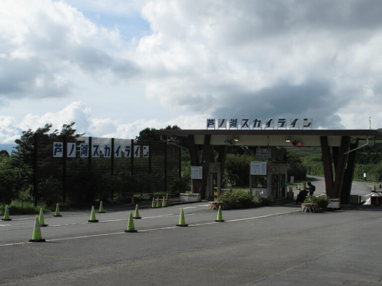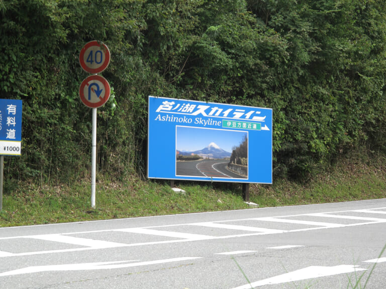 小田原厚木道路から箱根新道を経由し、箱根ICで降りるとすぐに芦ノ湖スカイラインの接続道路にアクセスできる。芦ノ湖スカイラインの青い大看板が目印だ。