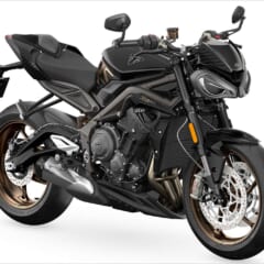 【'23 TRIUMPH STREET TRIPLE RS】■水冷4スト並列3気筒DOHC4バルブ 765cc 123ps/11750rpm 8.06kg-m/9350rpm ■188kg シート高825mm 17.4L ■タイヤサイズF=120/70ZR17 R=180/55ZR17 ■クイックシフター(アップ&ダウン)/ブルートゥース ※オプション ●色:カーボンブラック●価格:146万5000円