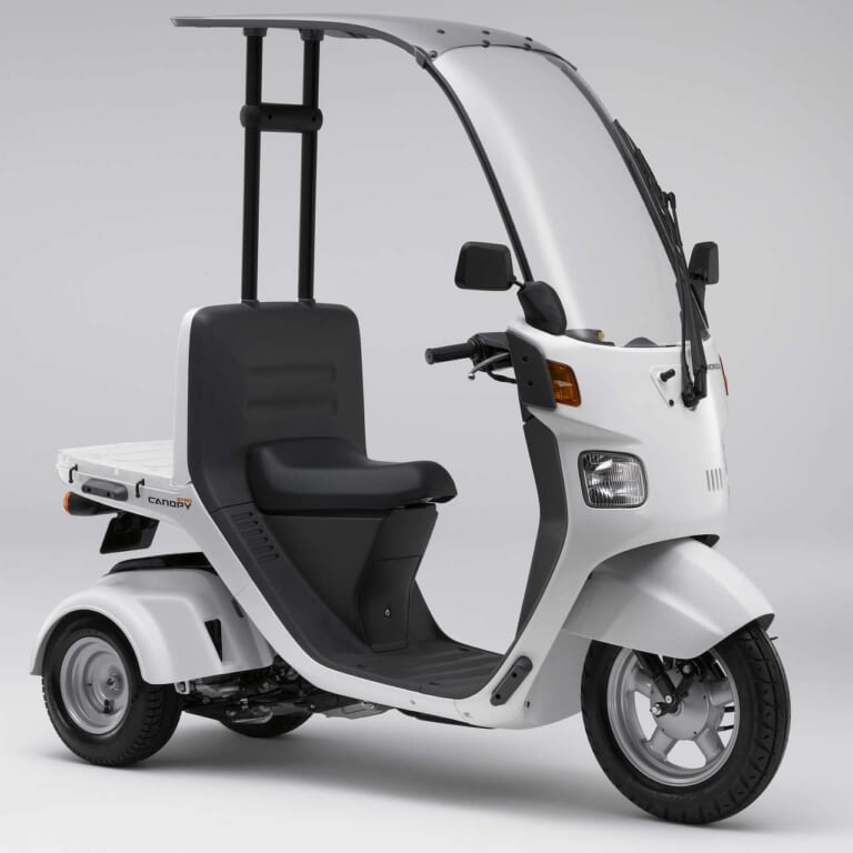 ’21年10月28日に登場した屋根付きのジャイロキャノピーe:。リヤデッキは車体と一体だ。こちらもリバース機能を装備する。