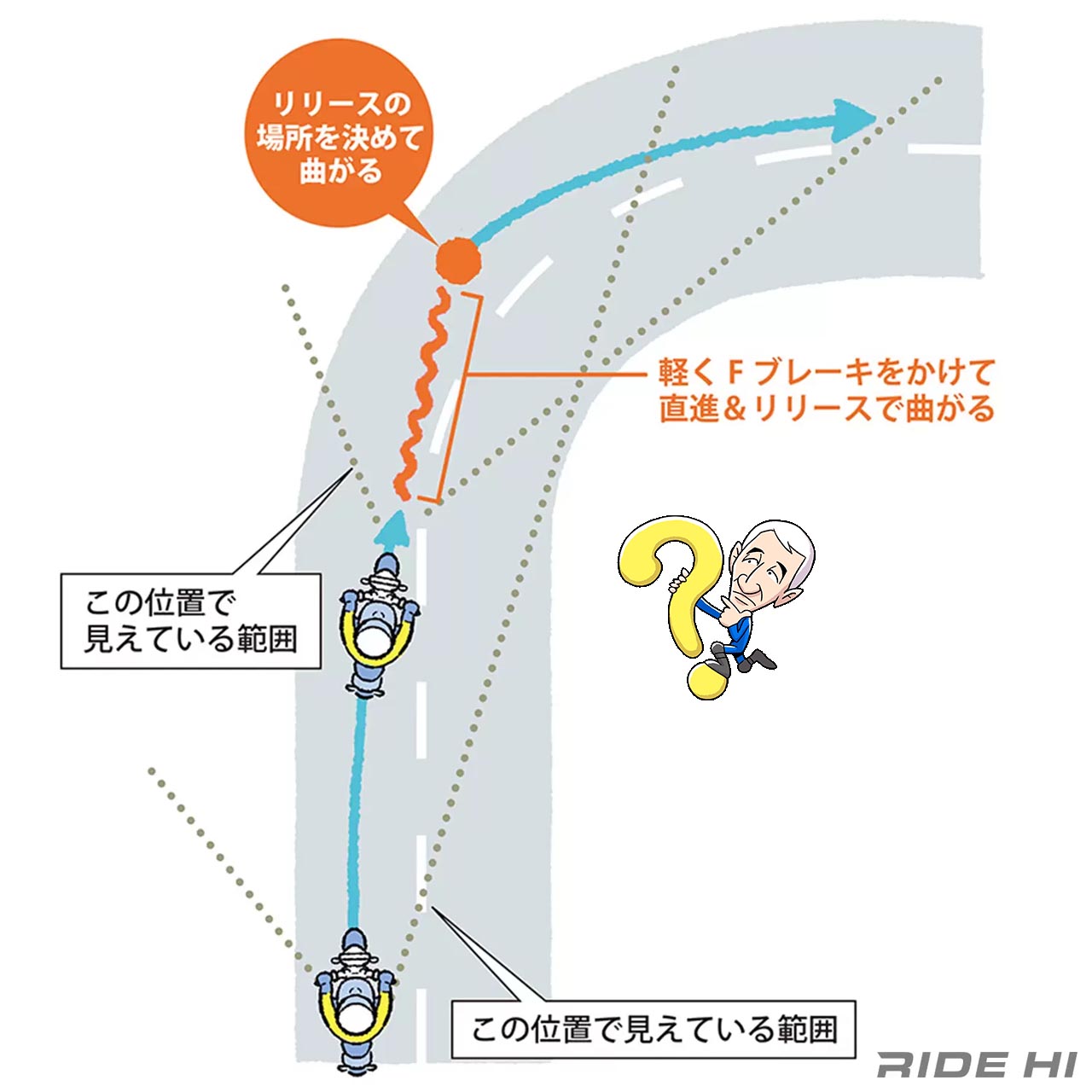 そうなると曲がり切れなくなる不安が先に立ち、カーブの手前でエンジンブレーキやブレーキをかけて速度を落としすぎてしまい、コーナーまで辿りついたときは車体を寝かす速度を遙かに下回り、失速しないよう入り口から加速する始末……ビギナーや久しぶりに乗るリターンライダーにありがちな状況です。