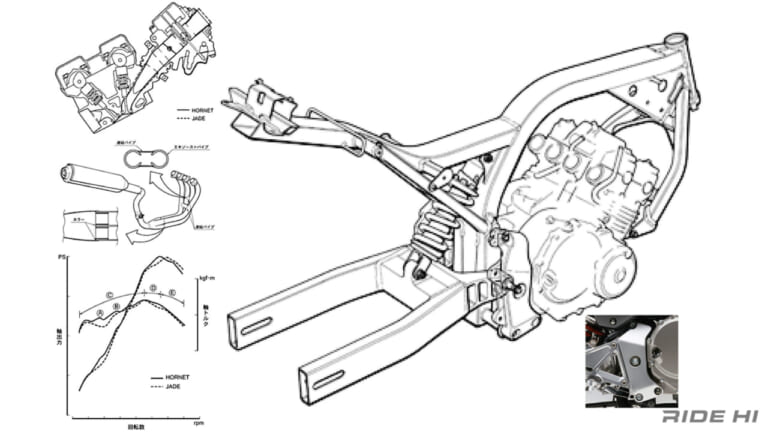 カラーオーダープランにはじまり車体をツートンに塗り分けるまでに! ホンダは1991年、250ccの4気筒カムギヤトレイン、CBR250FOURやCBR250RをベースとしたJADEを投入した。 JAD[…]
