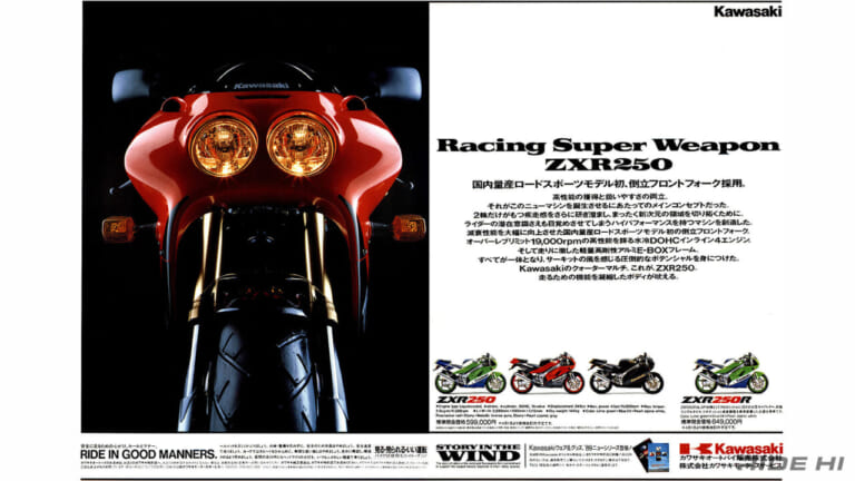 しかし1989年、さすがにカワサキファンの期待に応えようと、国内レース参戦と共にレプリカのZXRシリーズをリリース、250ccから400cc、そして750ccクラスとラインナップ、中でもZXR250は他がビギナーを意識した仕様と違い、すべてに400や750と同一レベルという豪華バージョンで一線を画していた。
