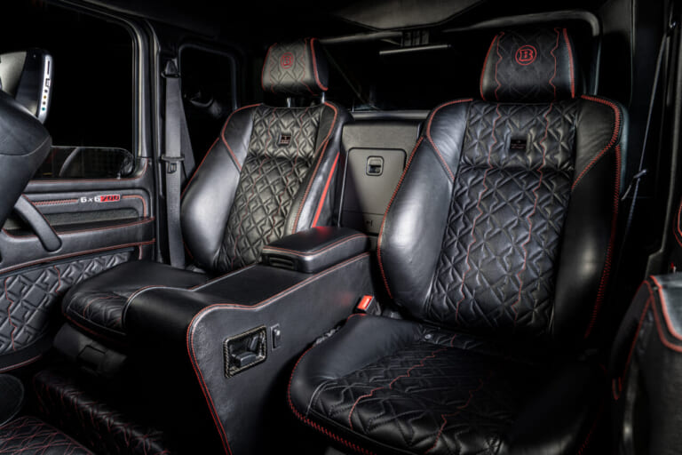 もちろん、インテリアはリッチ&ゴージャスな仕上がりで、ブラックのキルティングレザー、赤いステッチにブラバスのロゴと、いかにもビリオネア好みのコーディネート。