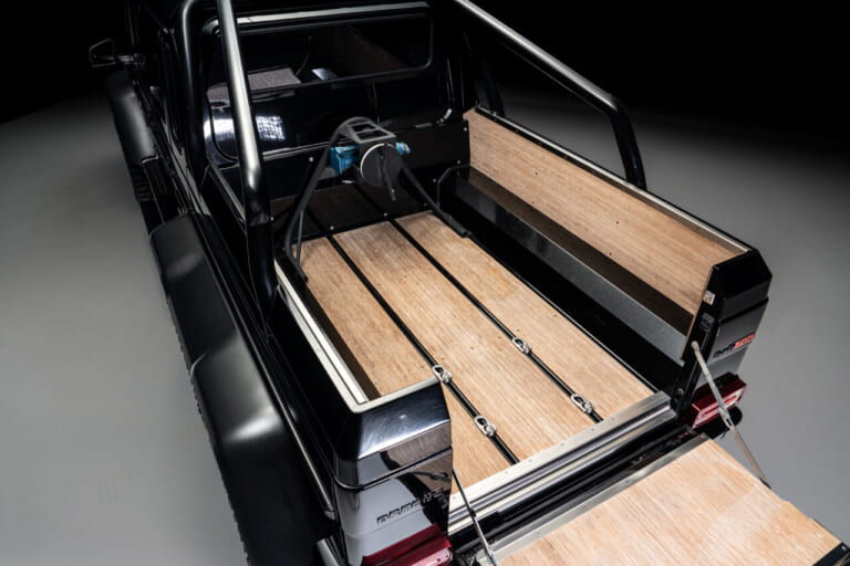 ピックアップのベッドもリッチなウッド張りで、中東のオイルダラーの好みを知り尽くしたブラバスらしいカスタムです。