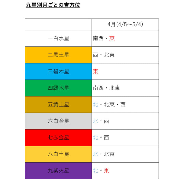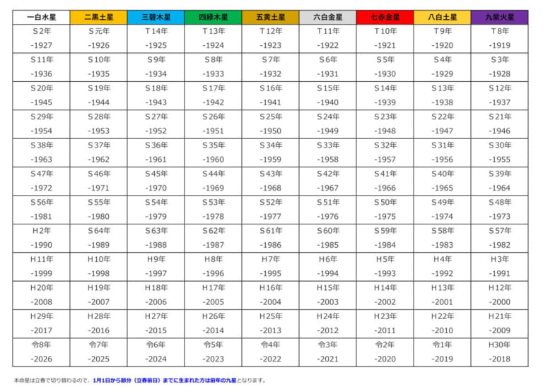 吉方位を割り出すには、まず自分の「九星」を知る必要がある。まだ自分の星がわからない人は、下の早見表で確認してから4月のリストを見てほしい。