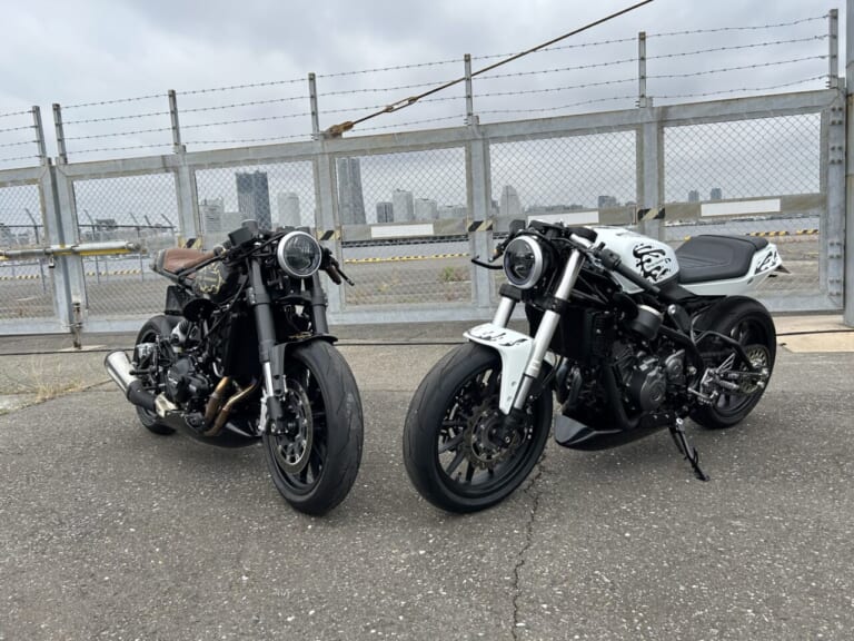 プライベートビルダー(現ハーレーダビッドソン高崎)“抹茶いぬ”こと越山大地さんが製作したX350(写真右)&X500のカフェレーサー。これを見て、ポポちゃんは「私もX350が欲しい」と決意した。