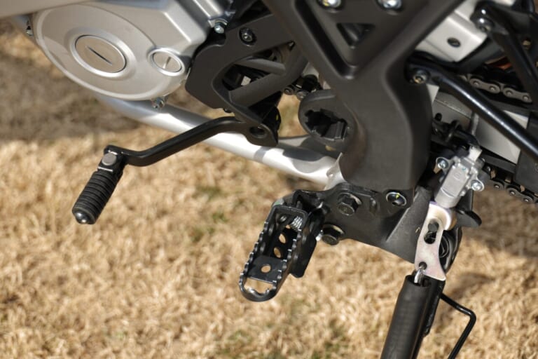 シート高875㎜。シートは高めに設定されているが、車両重量138kgの車体はスリムで支えやすい。また乗車時の沈み込みも大きいため、数値ほどの足着き性の悪さは感じす、両足で支える場合にも踵が数cm浮く程度となった。