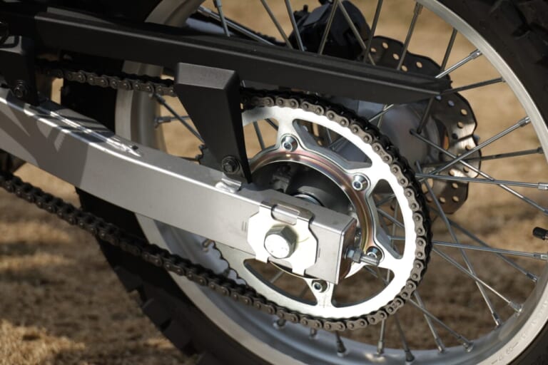 スプロケットは59丁と、トレールマシンではあまりお目にかからないくらい大きく、2次減速比は4.214(59/14丁)。1速アイドリングでは歩くような速度で進み、トルクも力強くエンストしにくい。