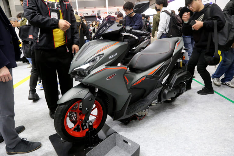 今年夏以降発売予定とされるスポーツスクーター、AEROX(エアロックス)155。街乗りとスポーツ走行をモード変更で愉しめる上、大容量の収納スペースを確保するなど実用性にも優れたマシンになっている。